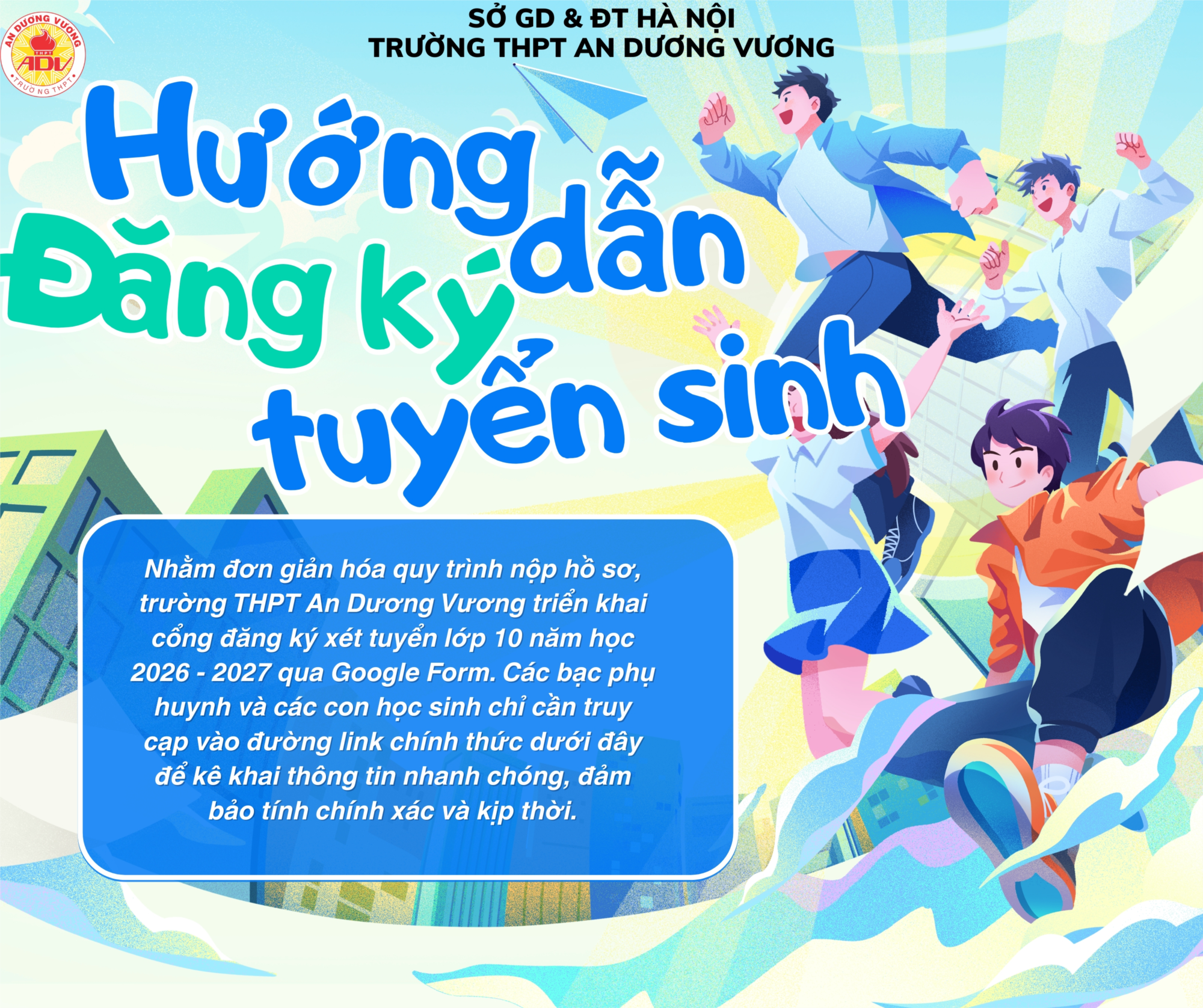 Nhằm đơn giản hóa quy trình nộp hồ sơ, trường THPT An Dương Vương triển khai cổng đăng ký xét tuyển lớp 10 năm học 2026 - 2027 qua Google Form. Các bậc phụ huynh và các con học sinh chỉ cần truy cập vào đường link chính thức dưới đây để kê khai thông tin nhanh chóng, đảm bảo tính chính xác và kịp thời.